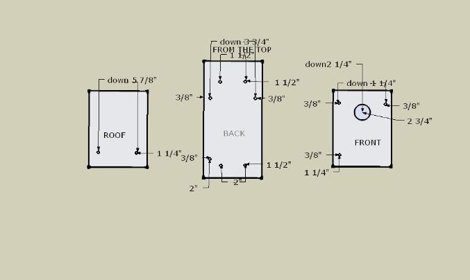 | When you have finished cutting all your pieces. You will then be ready to start drilling the entry and pilot holes. With a 1/8 drill bit per drill the front,back and roof of your house. Next mark and drill the entry hole using a 1 3/8 hole saw bit. |